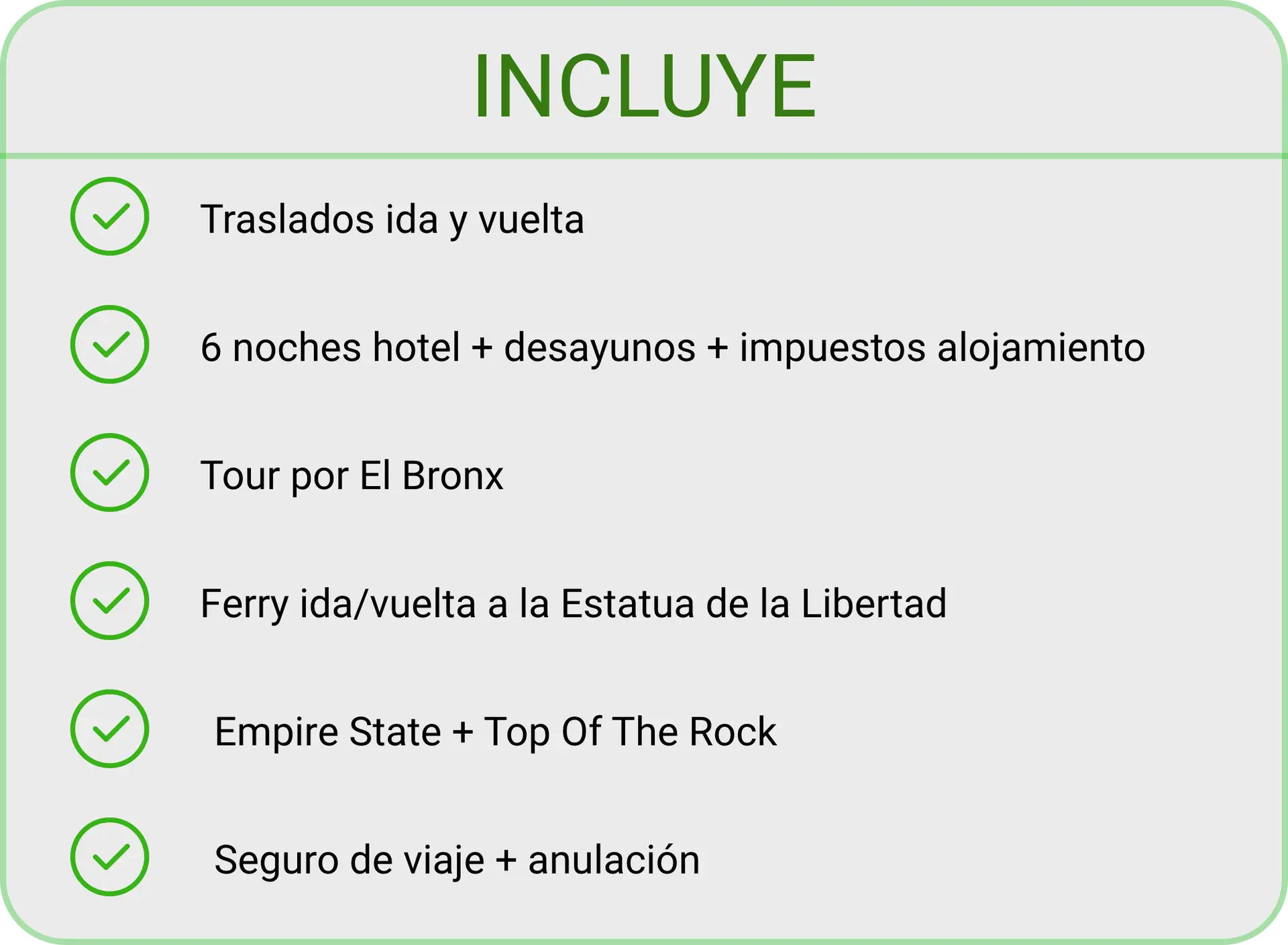 Finalizaremos la jornada en la bahía de Nueva York, disfrutando de un atardecer inolvidable frente a los rascacielos y respirando la magia de la Gran Manzana por última vez.